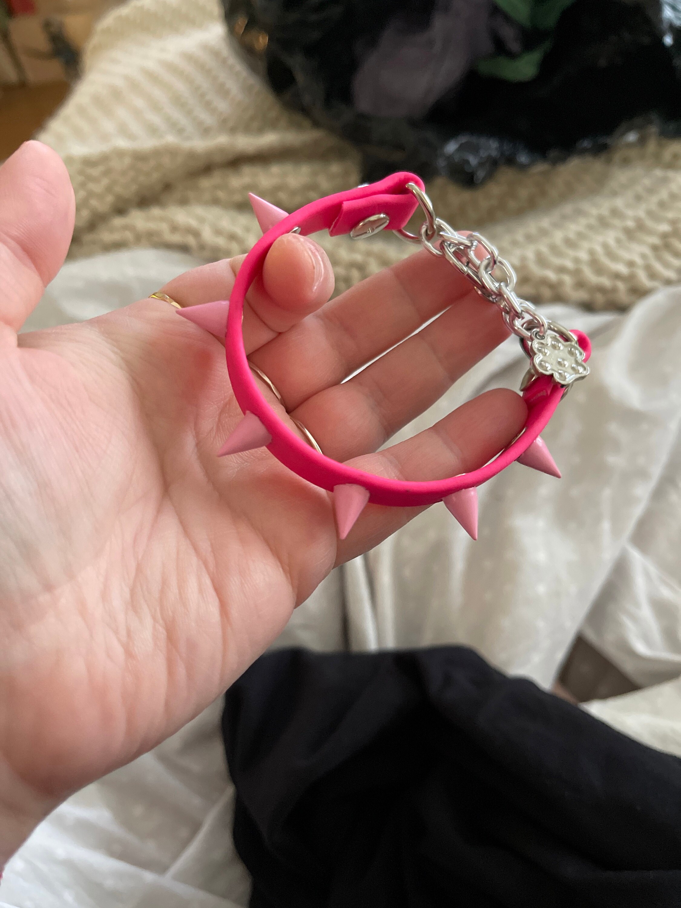 This features 1/2” wide biothane, alloy metal spikes, stainless steel d-rings and nickel free lobster clasp and lightweight chain. More links to make it more adjustable and finished with an optional jeweled paw print charm.